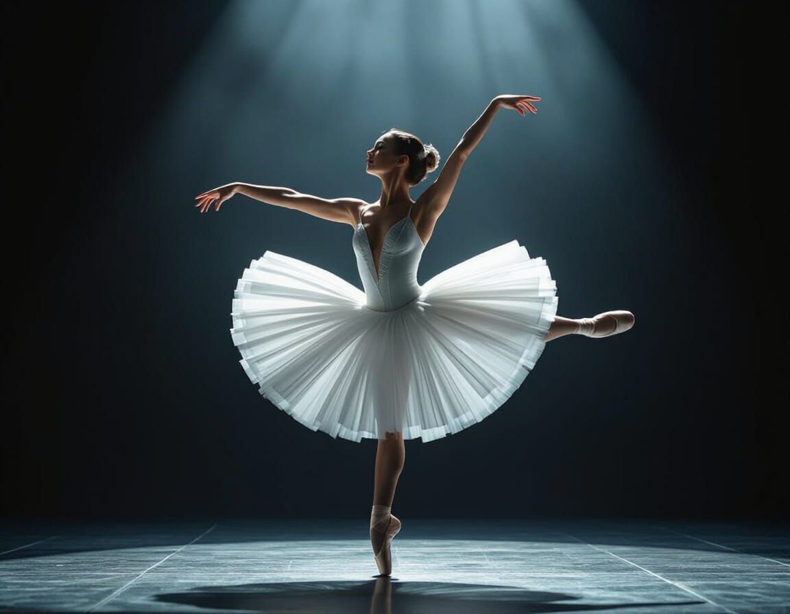 This image shows a ballerina in a white tutu captured mid-leap on a dark stage. A spotlight highlights her elegant pose and costume, with deep shadows and golden hour hues creating an ethereal effect. Ultra-detailed, high-speed photography style.