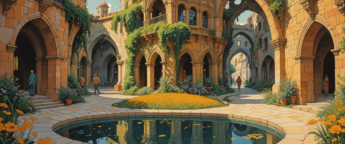 This image shows a fantastical architectural scene with people walking in a peaceful commune. Colorful flowers bloom in vibrant yellow-orange hues, illuminated by soft sunlight in a watercolor and gouache style.