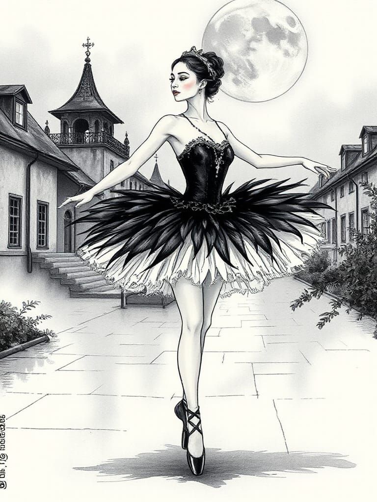 This image shows a ballet dancer in a dramatic feathered tutu and majestic black dress, performing the Dark Swan ballet. The high-contrast drawing features bold, expressive lines and Art Nouveau elegance.