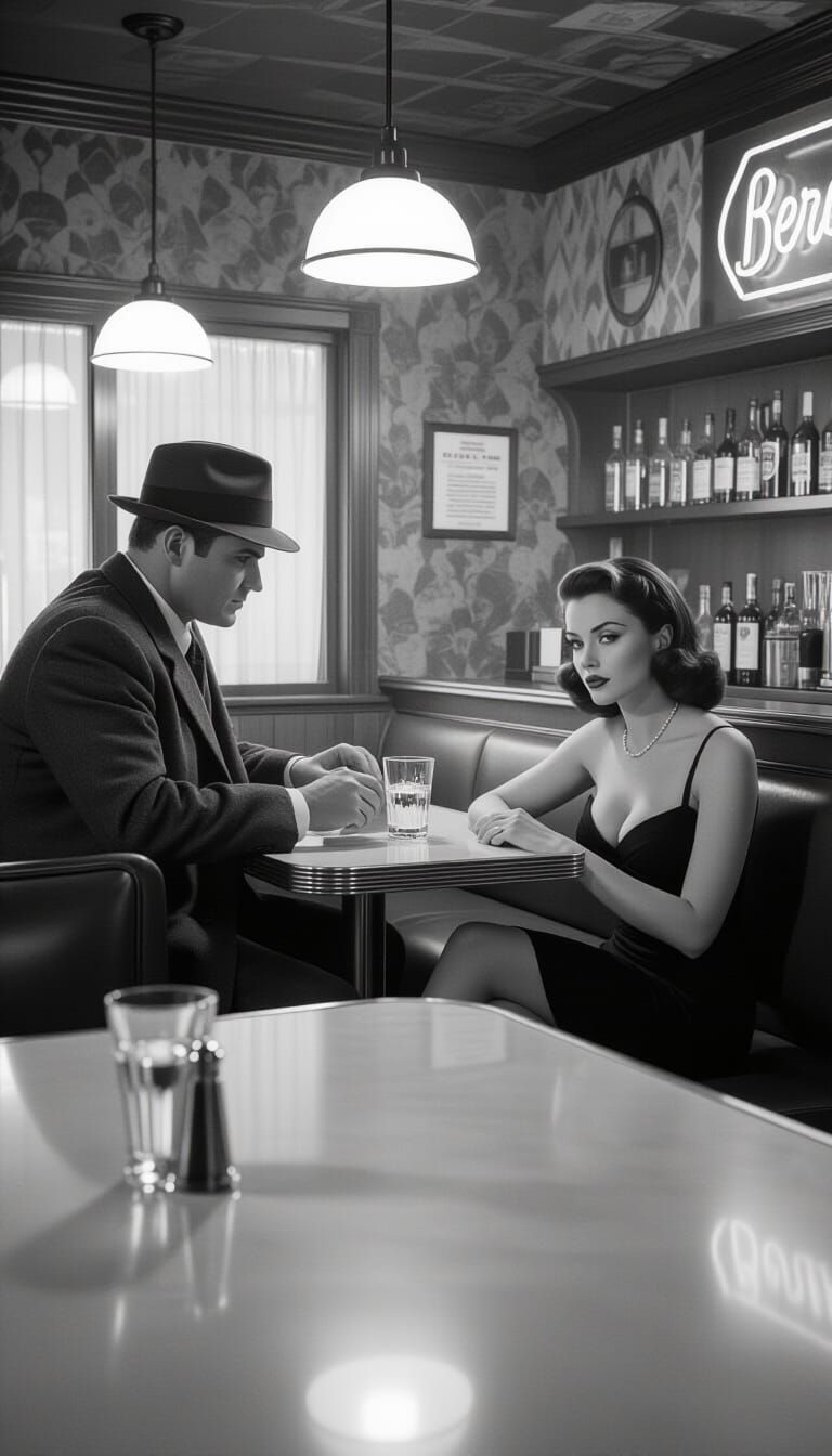 This image shows a scene from a vintage film noir detective movie, set in a 1950s diner. A stranger walks in on a mysterious woman at the bar in deep color.