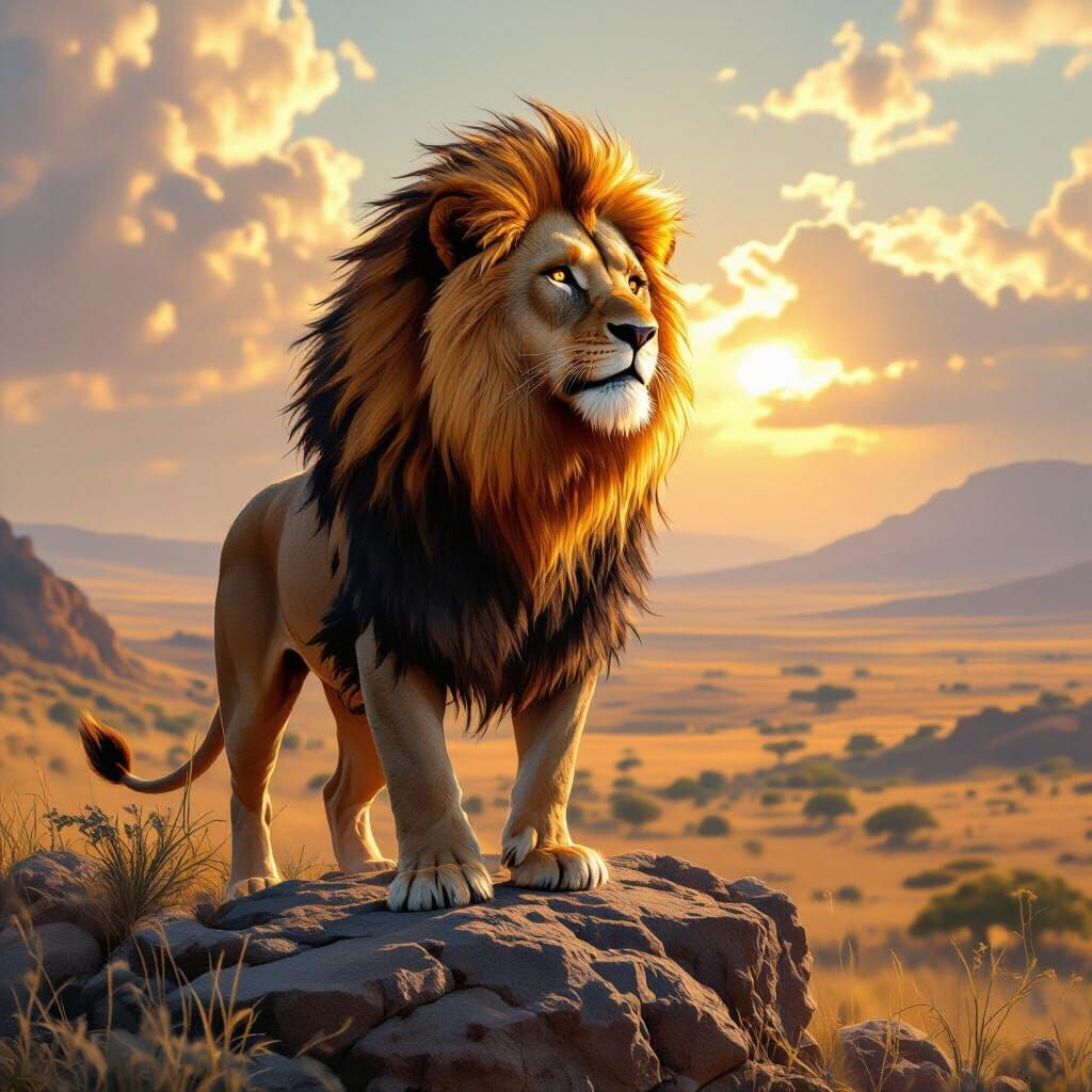 A striking picture of a lion with a fiery mane standing on a rocky crag, surveying a sunlit savanna. The scene is rendered with dramatic lighting and vibrant colors as hyperrealistic fantasy art.
