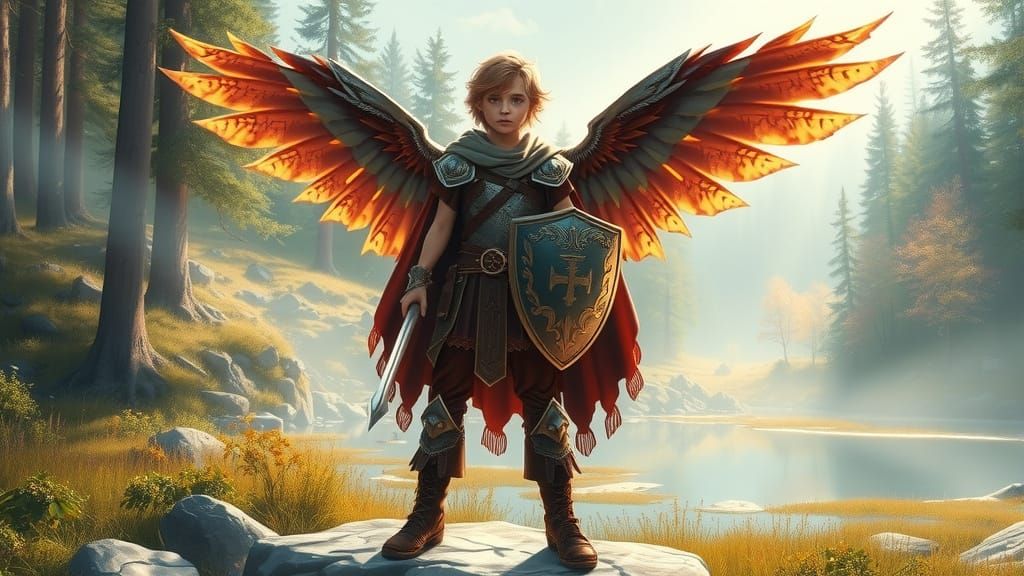 A striking picture of a winged youth in a forest clearing. Clad in leather armor and cape, he holds a sword and shield, his wings spread wide, rendered with ethereal detail and dramatic lighting.