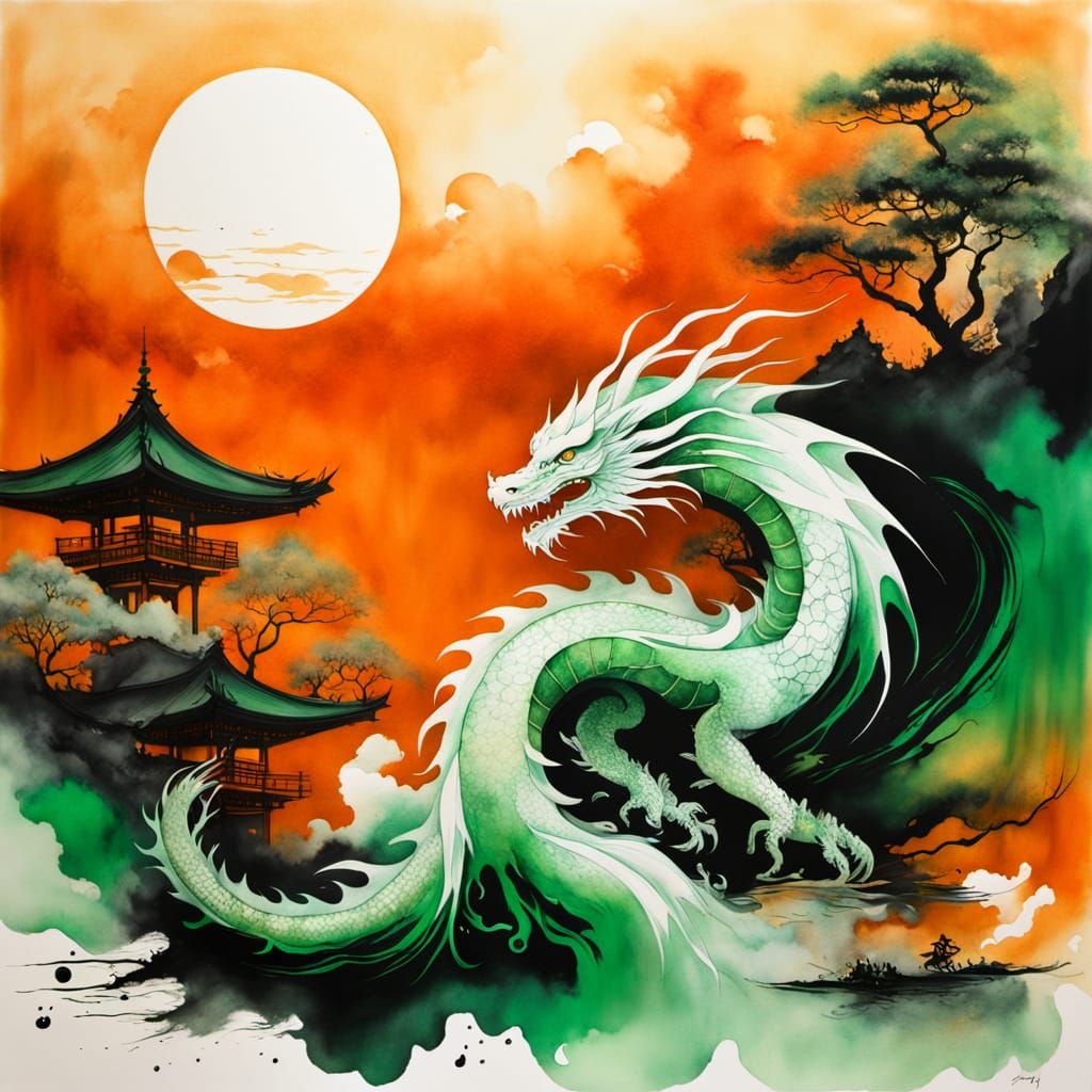 This image shows a dragon rendered with vibrant green and black ink bleeding on silk. Gold accents shimmer throughout the artwork in an abstract romanticism style.