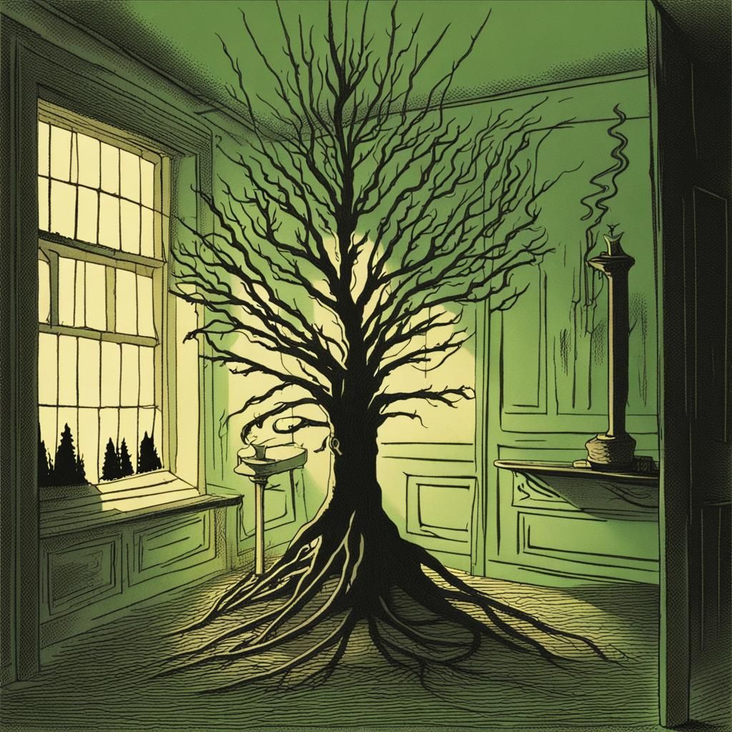 This image depicts a darkly lit room with a twisted Christmas tree casting eerie shadows. Grotesque ornaments hang on the branches, lit by dim, blood-red lights, creating an ominous ambiance.