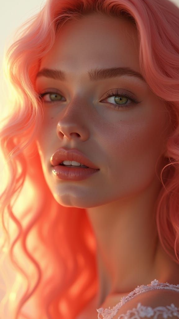 This image features a stunning woman with porcelain-like skin and coral-pink hair, set against a soft pastel gradient background. Her piercing green eyes and full lips exude an effortless charm, while her skin radiates a surreal, liquid-glow effect.