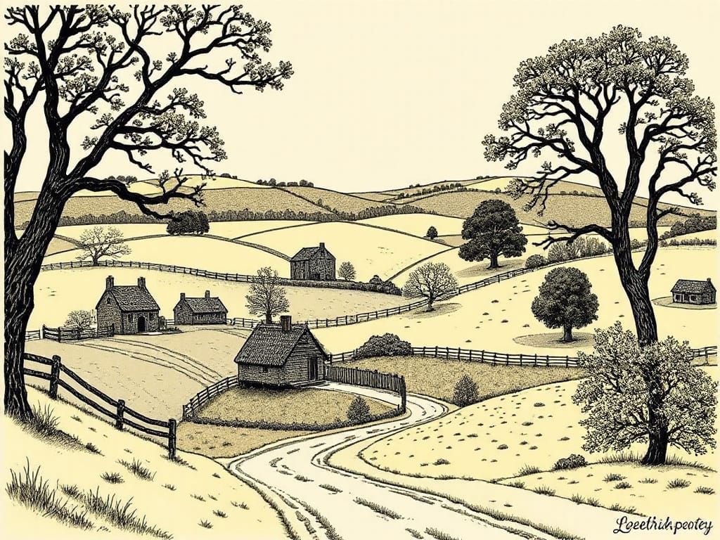 This image shows a quaint countryside scene reminiscent of Beatrix Potter's illustrations. The image evokes a vintage serigraphy style and a retro aesthetic.