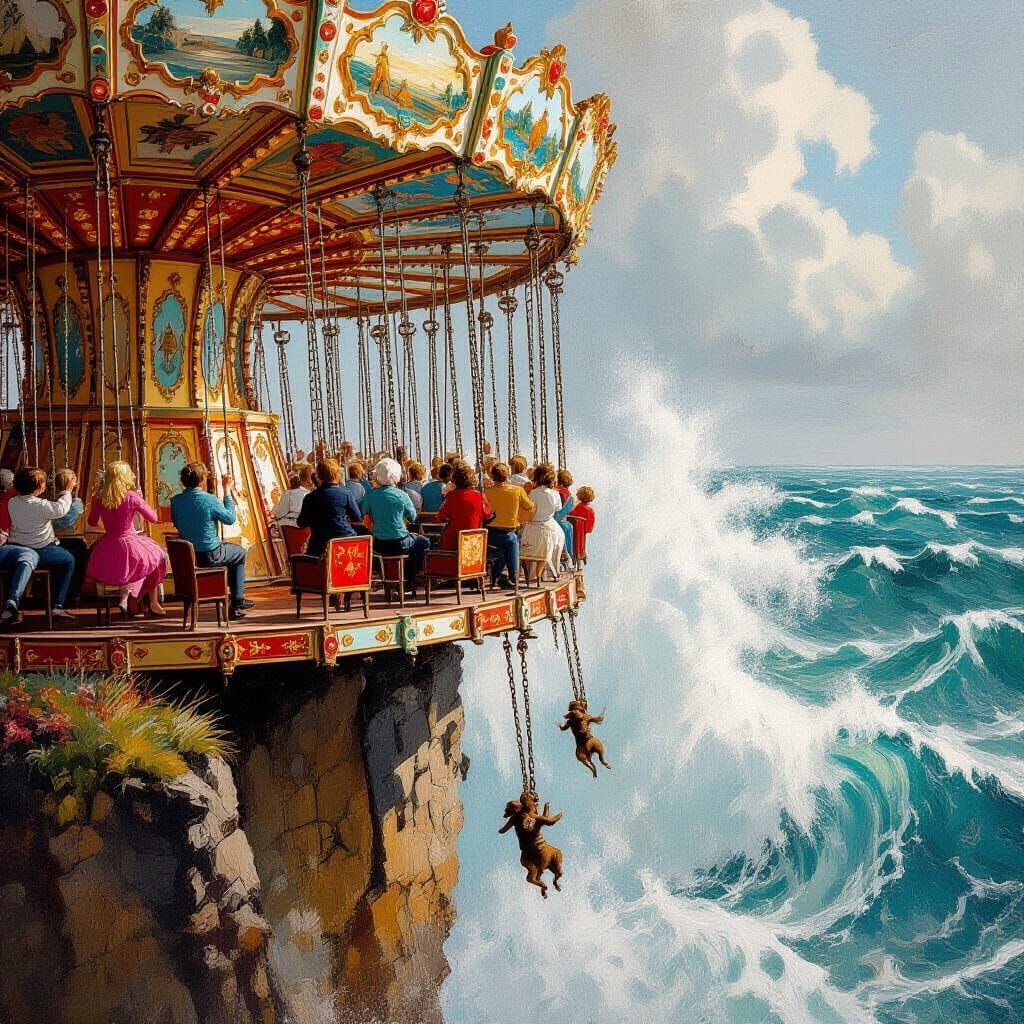 This image shows a carousel perched precariously on a cliffside, waves crashing dramatically around it. Rendered as an oil painting, the scene captures the emotions of the riders, some amused, some scared.