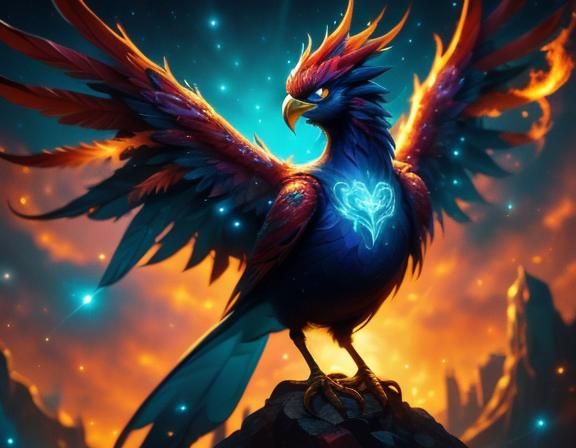 This image shows a vibrant phoenix soaring through a night sky. The artwork evokes a sense of magic and wonder, presenting a modern fantasy aesthetic.
