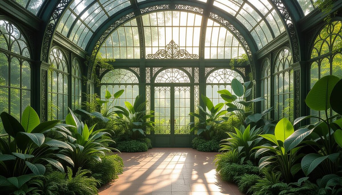 This image shows a sunlit greenhouse interior with elaborate ironwork and abundant plants. The scene is rendered with an ethereal, fantasy aesthetic, reminiscent of Art Nouveau.