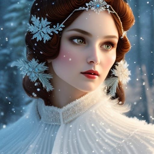 A beautiful, ethereal winter goddess portrait with a snow dress and flower crown. This image showcases dynamic lighting and intricate details, rendered in a fantasy art style.
