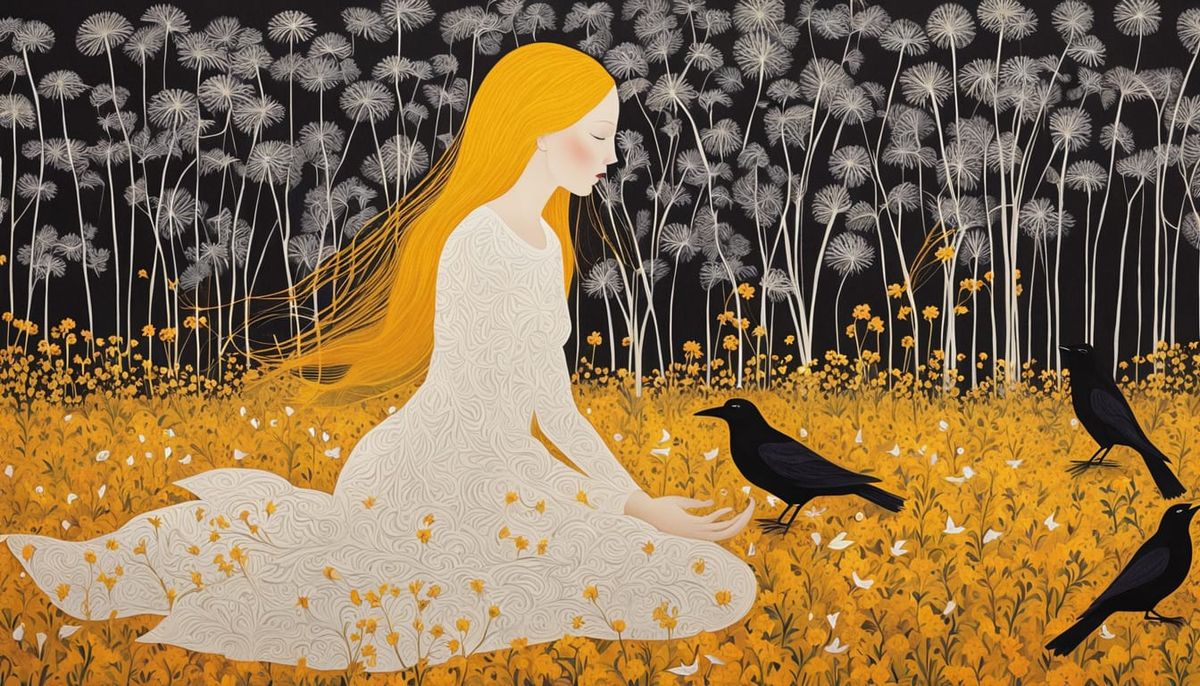 This image shows a serene woman kneeling among dandelions, tending to ethereal birds. The scene blends bio-art with organic patterns, creating a dreamlike atmosphere with intricate textures.