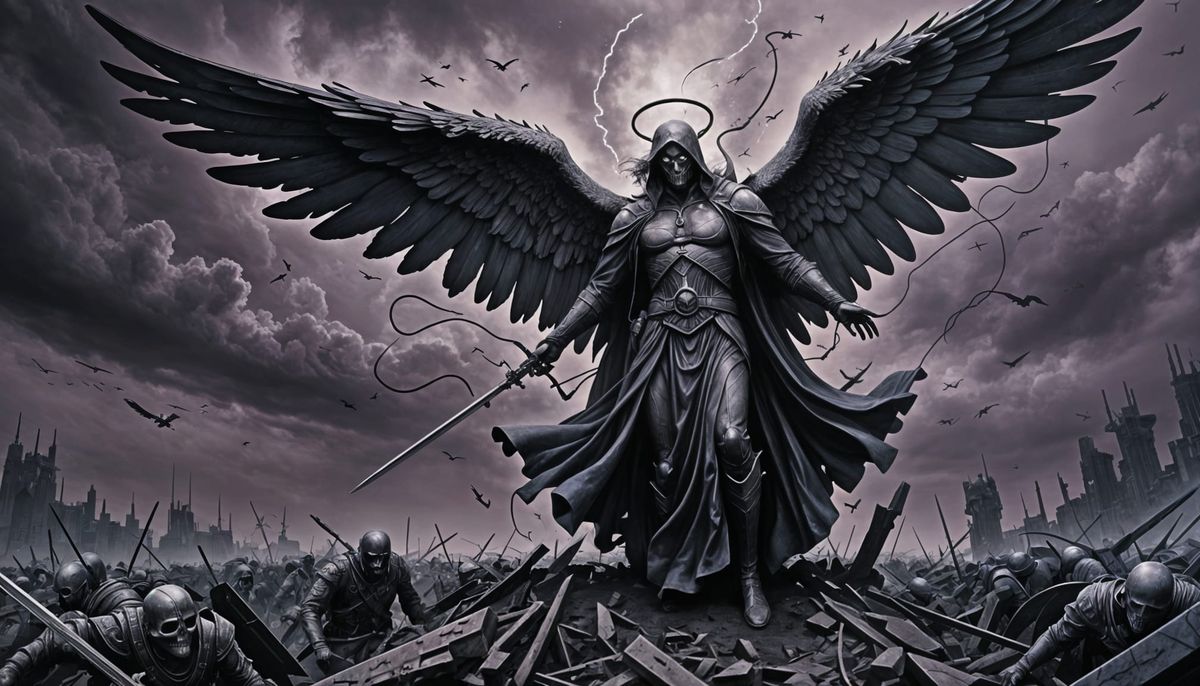 This haunting image depicts the Angel of Death hovering above a war-torn landscape in a dark, mystical realm. Created in a style reminiscent of Moebius, it features vivid, surreal details and an ominous atmosphere.