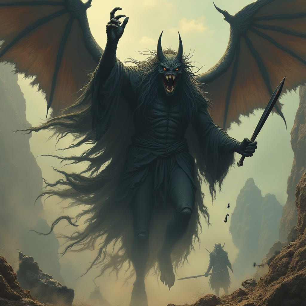 "a fierce flying monster fighting a hunter: a shape shifter wrapped in dark magic, raising one hand to cast a spell and holding a cursed bloody dagger in the other, the ponsters reach out to him with their claws and expose their fangs the hunter fights her alone misted with dark magic particles using them as his main weapon his eyes glowing with red and his dagger drips with de blood of the beast"
