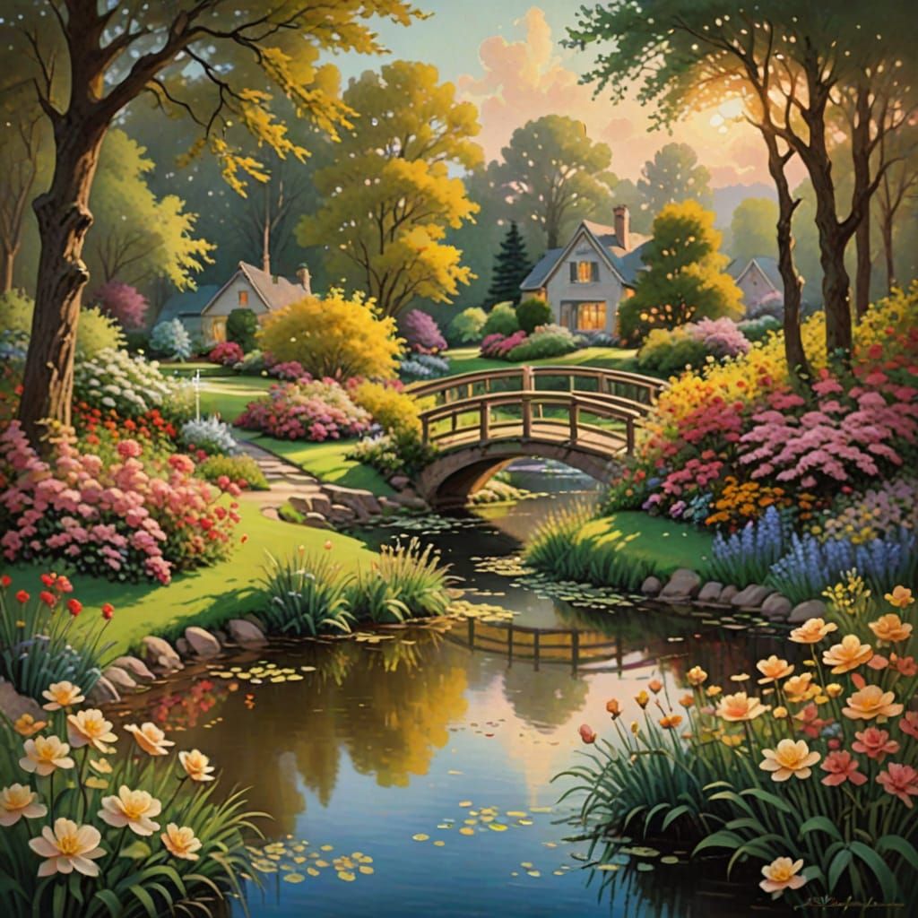This serene oil painting captures a peaceful golf hole surrounded by vibrant flowers, a gentle stream, and lush greenery, bathed in the warmth of golden hour light.