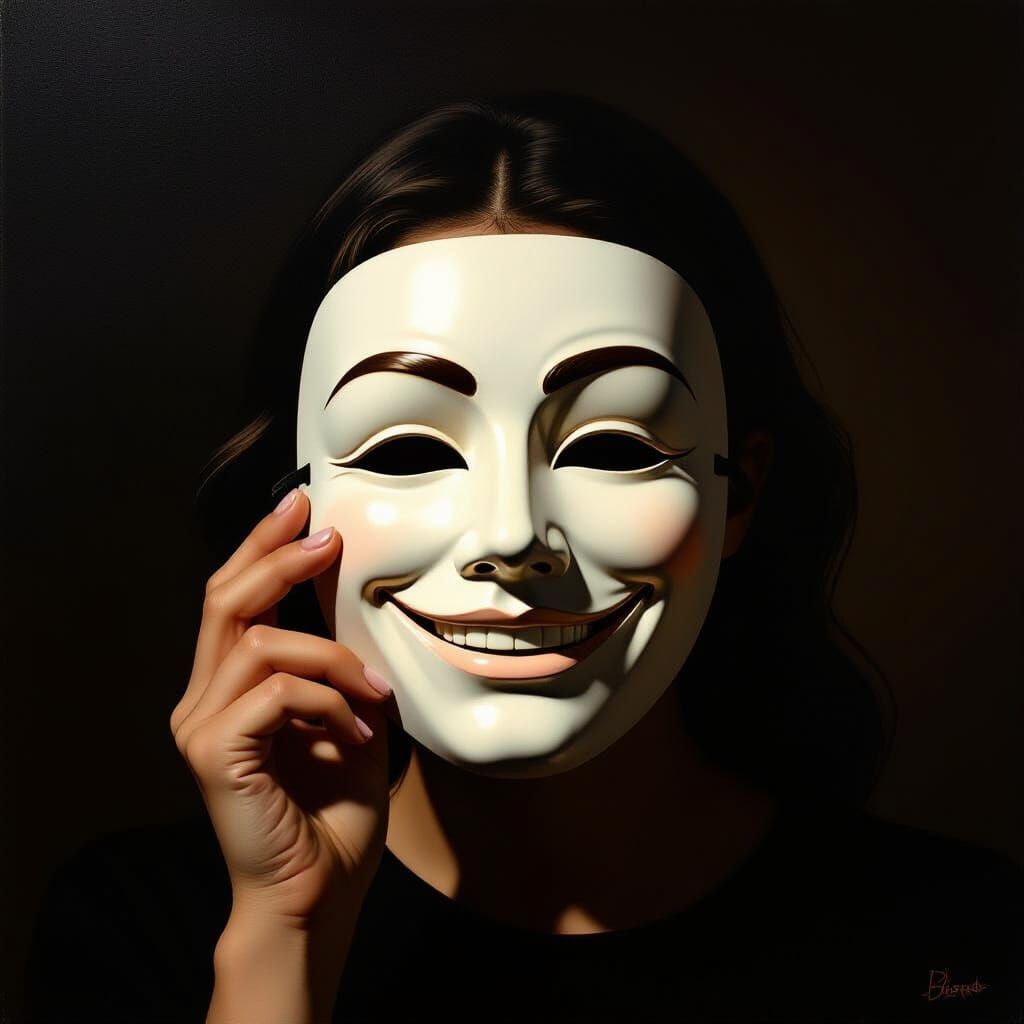 This image shows a person concealing their face with a white smiling mask against a dark void. Dramatic lighting highlights emotional duality, rendered in a Caravaggesque style with deep colors.