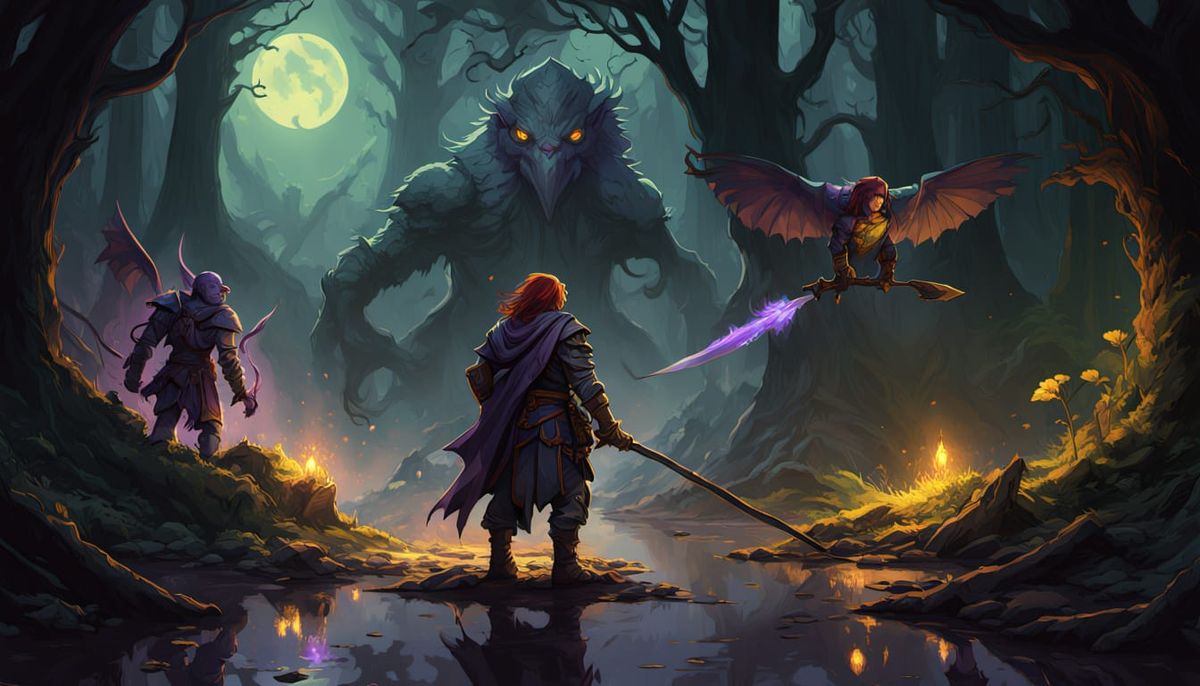 This image depicts a dramatic fantasy scene at dusk, featuring a group of adventurers standing on a muddy forest road, surrounded by goblins and the wreckage of a supply cart. The artwork showcases a cinematic style with moody lighting and high contrast, evoking a gritty and dark fantasy atmosphere.