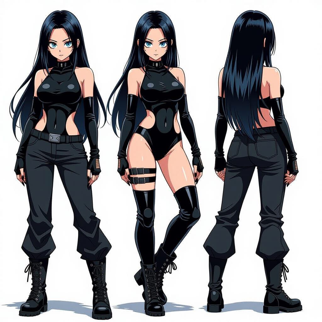 This concept art features a female anime character with long black hair and blue eyes, wearing a stylish black bodysuit, baggy pants, and combat boots. The illustration style is dynamic and bold, with dramatic lighting.