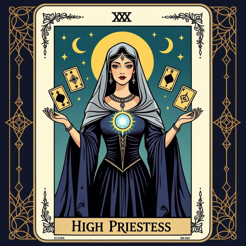 The High Priestess — She speaks the language of silence. Dreams bend to her will, and every secret whispered finds its way to her hands.