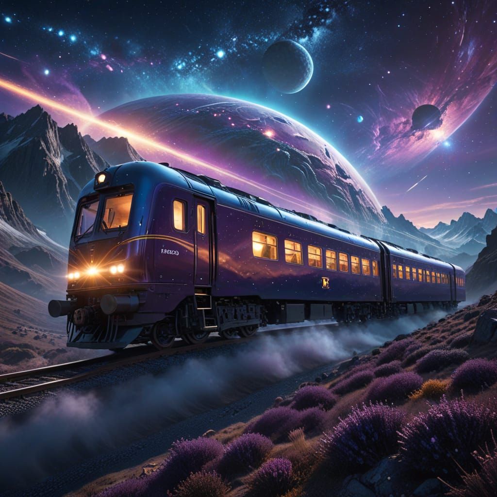 This stunning image captures the Orient Express train speeding through a serene, starry mountain range on a distant planet. The photorealistic digital art features cinematic lighting, vibrant colors, and subtle lens flares, creating a dreamy, otherworldly atmosphere.