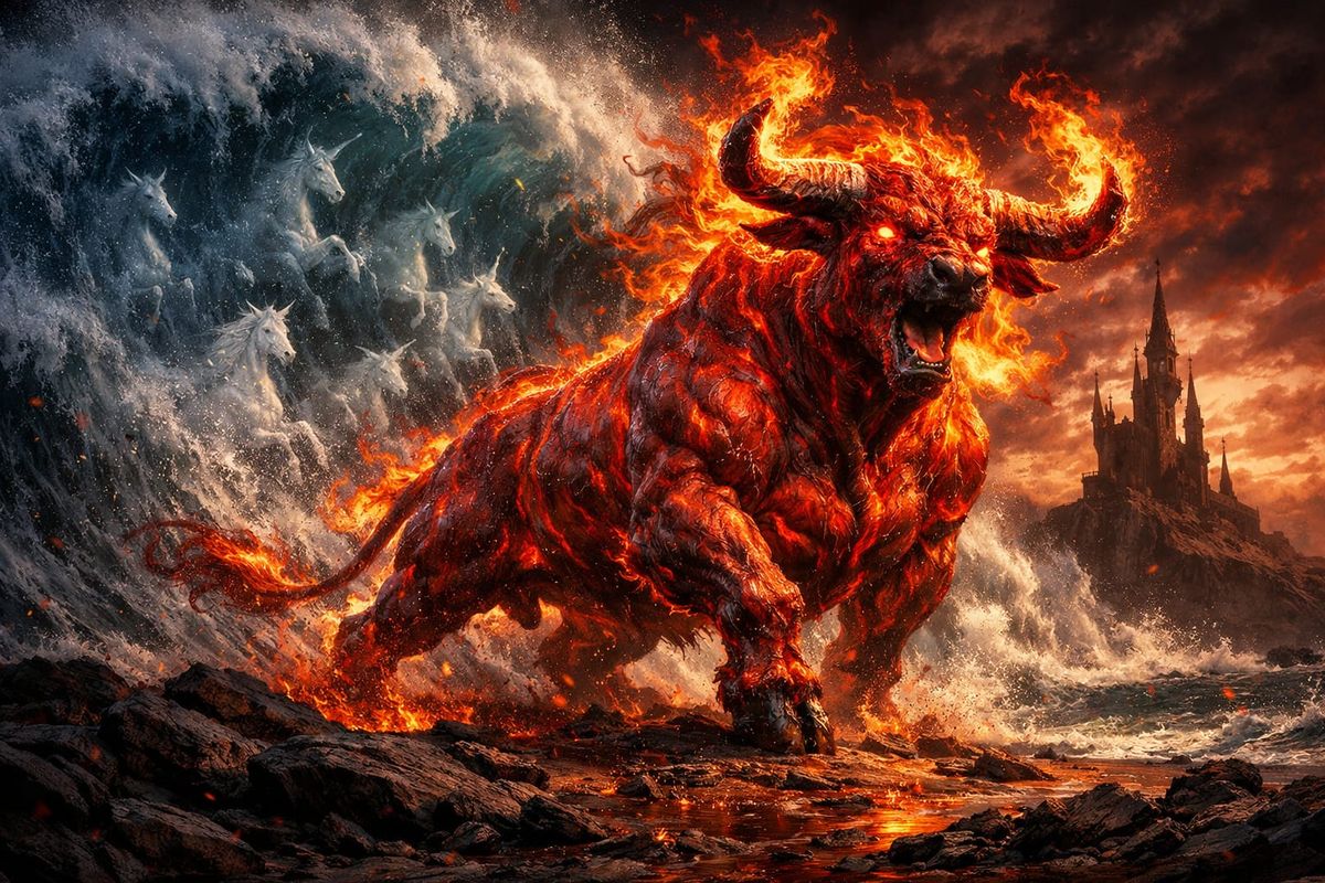 This hyper-realistic fantasy concept art depicts a colossal, flaming Red Bull confronting a towering ocean wave filled with shadowy unicorns. Dramatic lighting and crimson tones enhance the epic scene.