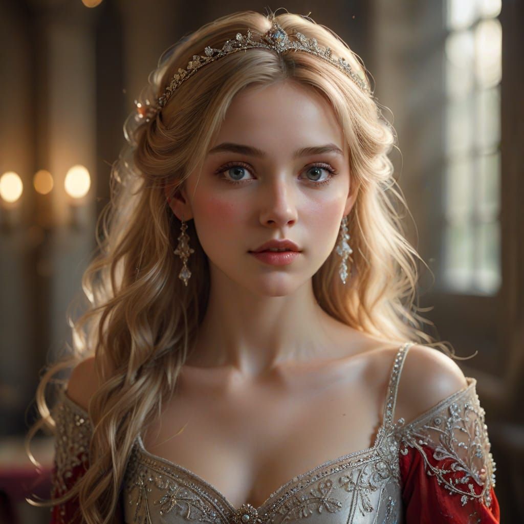 This image shows a beautiful princess with long golden hair, wearing a stunning red and silver ball gown, set against a romantic and dreamy background with delicate lace details and intricate silver embroidery.