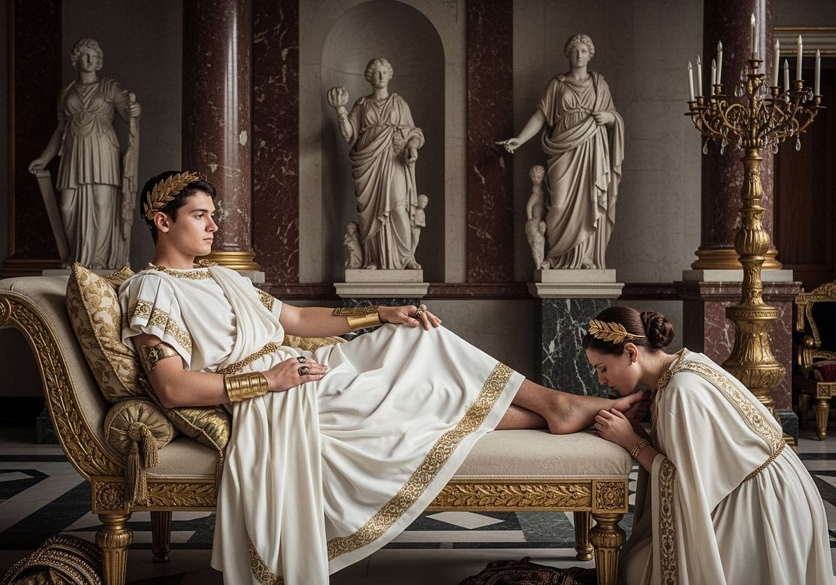This image depicts a young Roman emperor relaxing in his palace. The scene includes a priestess and luxurious decorations, captured with natural lighting and a shallow depth of field in the style of professional portrait photography.