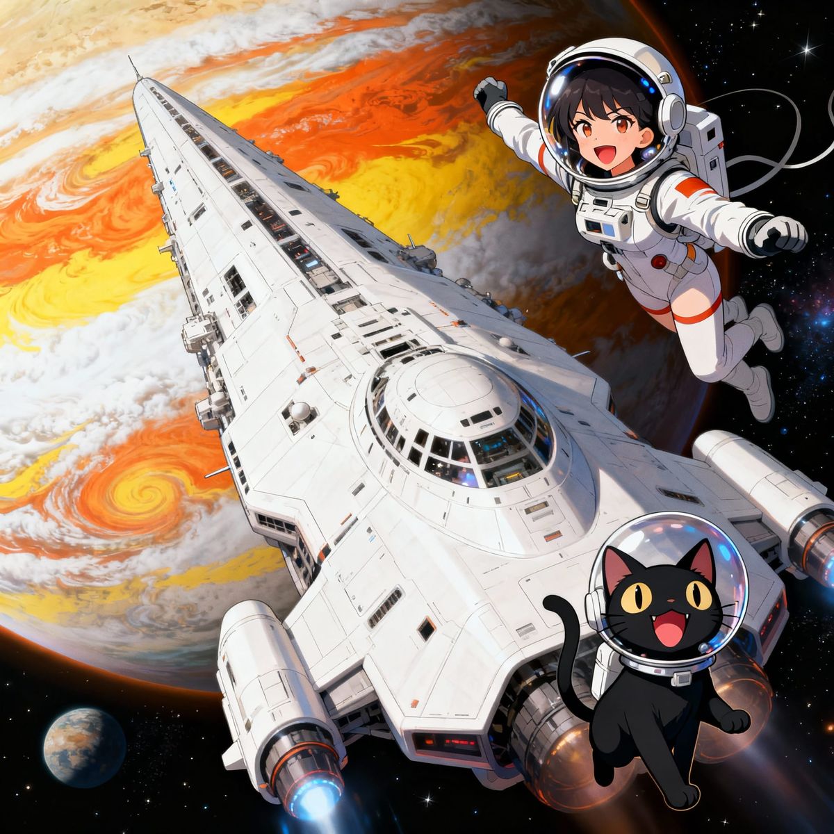 This image depicts a woman and a black cat, both in space suits and helmets, floating near a large white starship. They are in orbit around a gas giant with colorful clouds.