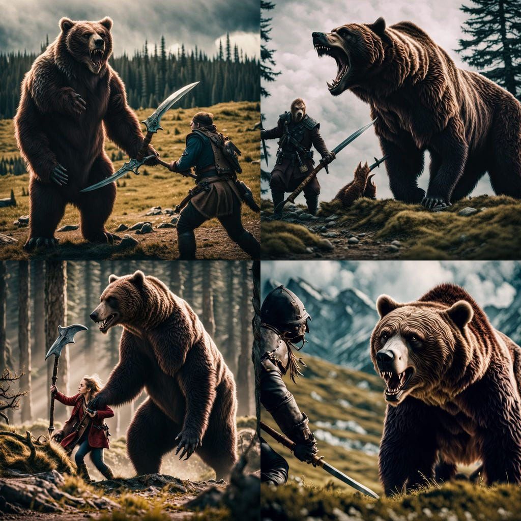 This image shows a dramatic film still of a grizzly bear wielding scythes against a wolf and an eagle. The scene features cinematic lighting and a gritty, atmospheric aesthetic.
