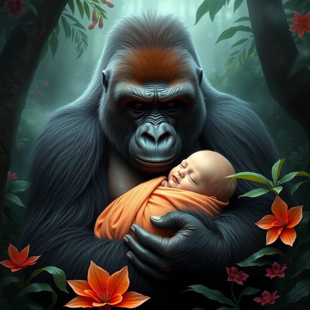 A photorealistic portrait of a large gorilla cradling a newborn baby in a misty forest, surrounded by lush flora and fauna, with delicate linework and vibrant colors reminiscent of Art Nouveau patterns.