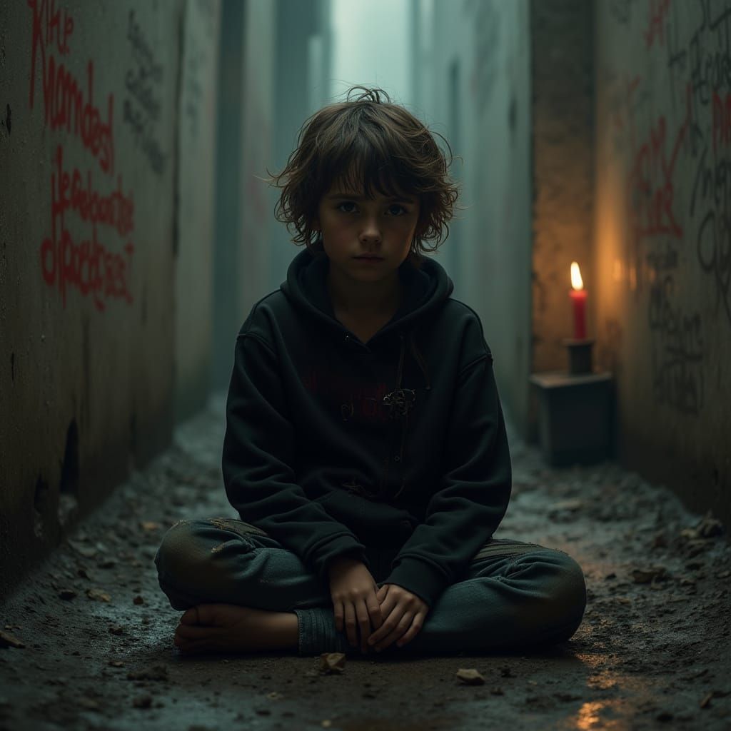 A somber, cinematic image of a young boy surrounded by dark, negative emotions, set against a backdrop of a dystopian world, with intricate details and a haunting atmosphere