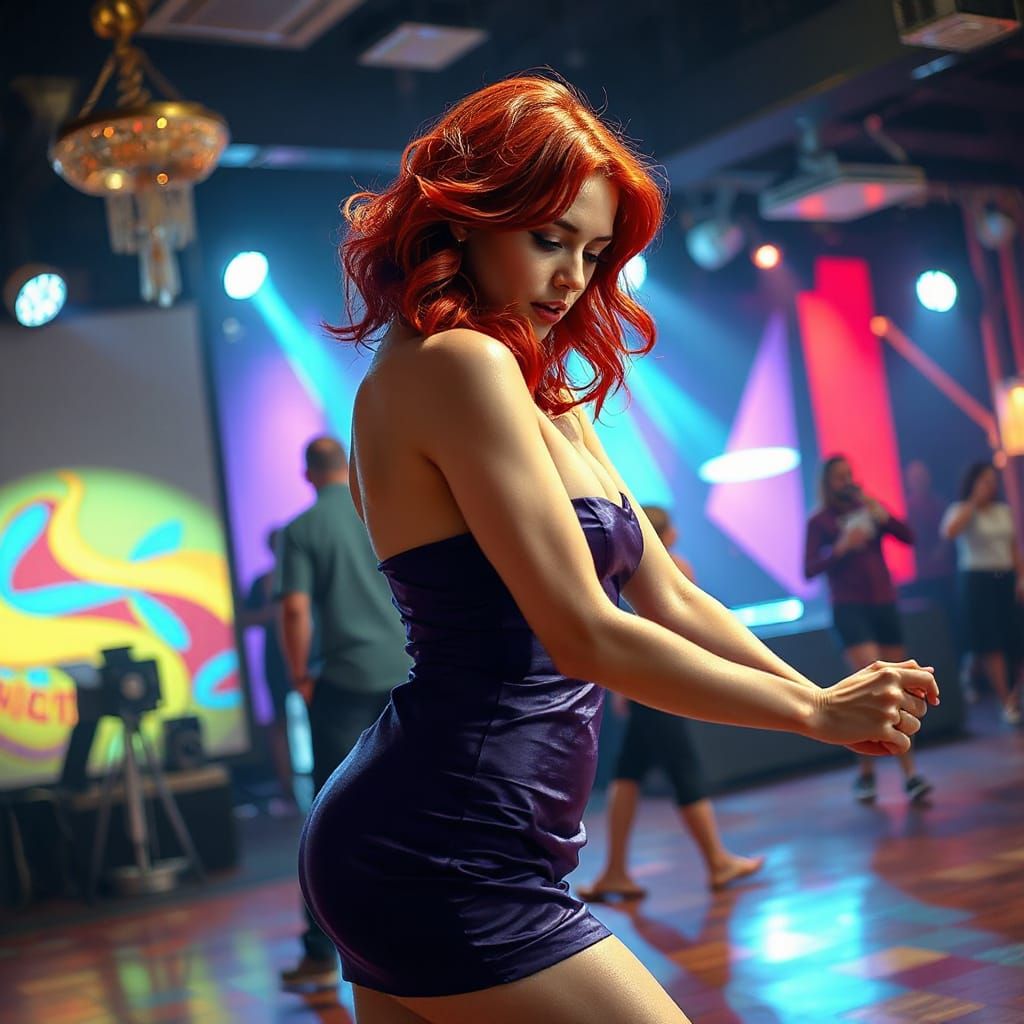 This image shows a vibrant redhead woman dancing in a bodycon dress. The hyperrealistic style and rich colors create a dynamic and detailed scene with dramatic lighting.