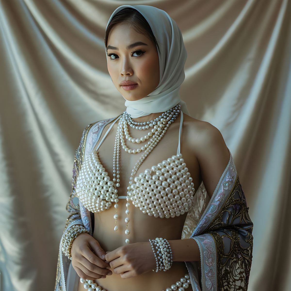 This image shows an Asian woman in pearl jewelry and a hijab. She poses confidently against a shimmering backdrop, with soft lighting highlighting the opulence of the pearl embellishments.