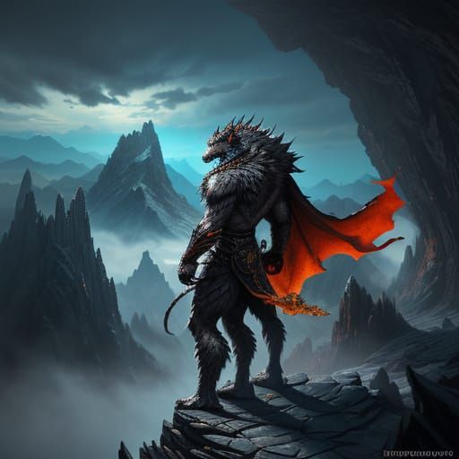 This image shows a dragon-wolf man on a mountain peak, rendered as detailed fantasy concept art. Features intricate scales, flowing fur, and a fantastical landscape with teal and orange lighting.