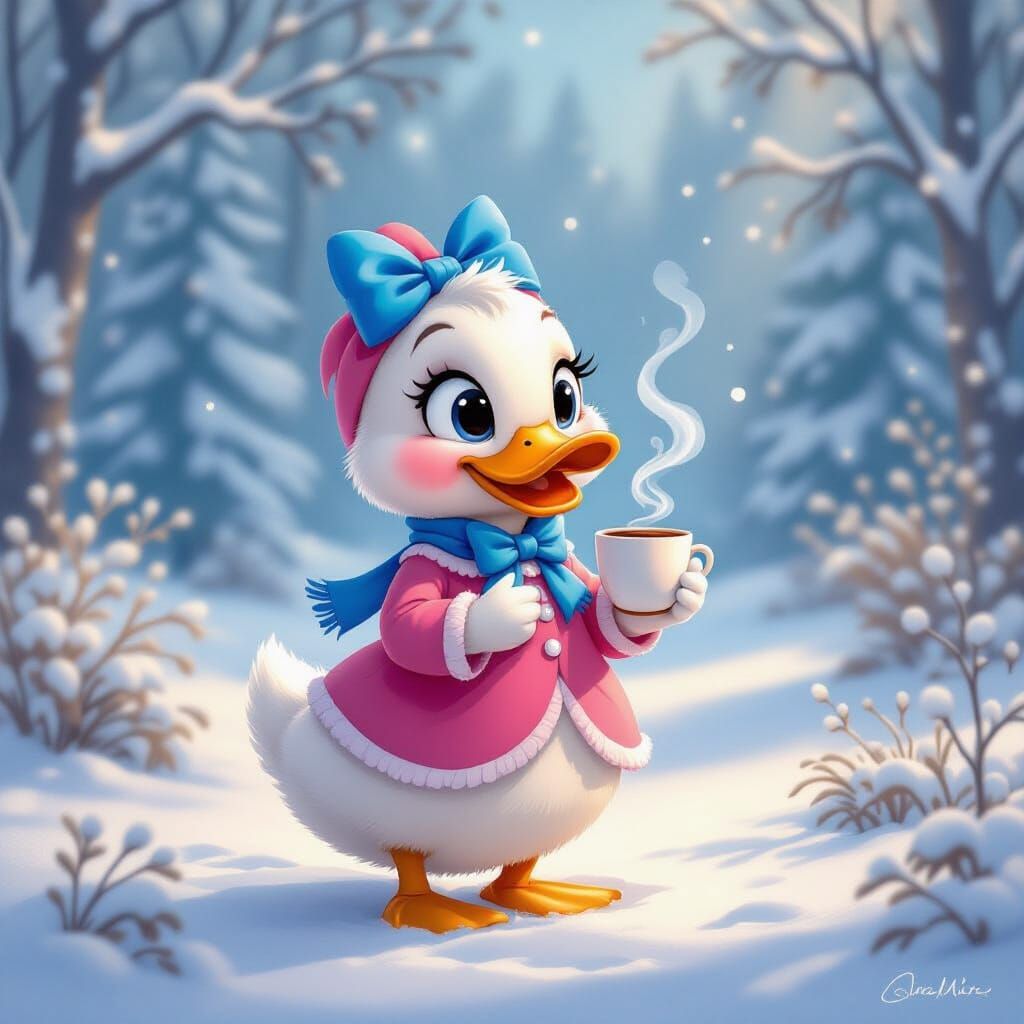 This image shows a joyful cartoon duck in a charming, whimsical digital art style. The duck wears a colorful dress and holds a warm drink in a serene, snow-covered autumn setting with soft lighting.