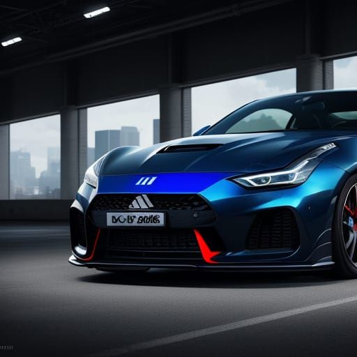 A hyper realistic digital painting featuring a man in an Adidas shirt beside a sleek car. The image boasts cinematic lighting, detailed textures, and a vibrant red and blue palette. Award-winning quality.