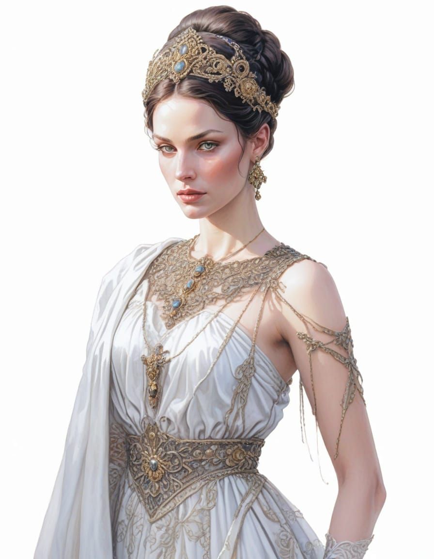 A striking picture of a fair-skinned woman with dark hair in a sunset landscape. This Renaissance-style portrait features soft lighting and luxurious fabrics, reminiscent of heroic fantasy art.