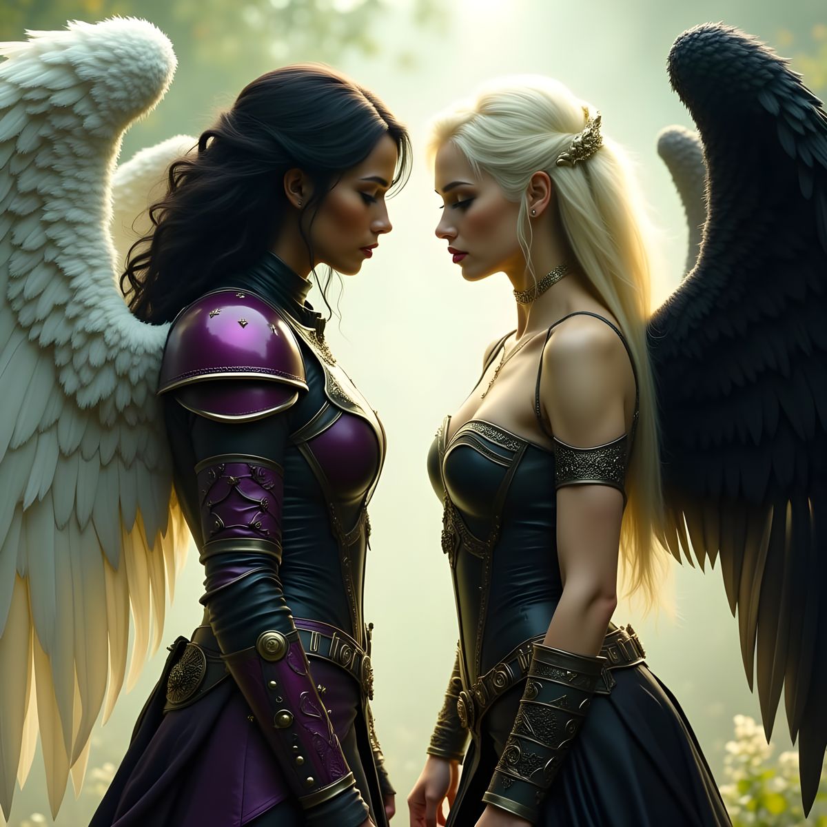 This image shows two beautiful angels poised for battle. One angel has dark hair and white wings, clad in purple and green armor. The other has platinum blonde hair and black wings, wearing black and gold armor in a cinematic style.