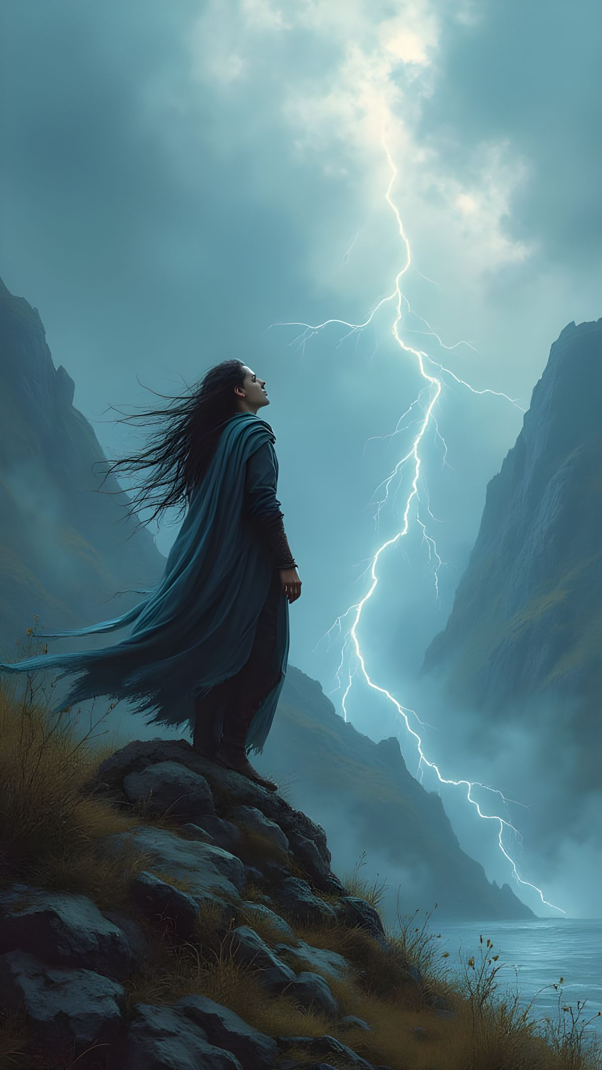 A striking picture of a warrior on a hilltop enduring a storm. Lightning illuminates distant mountains in this digital painting. The scene conveys intensity and raw emotional power in a semi-realistic fantasy style.