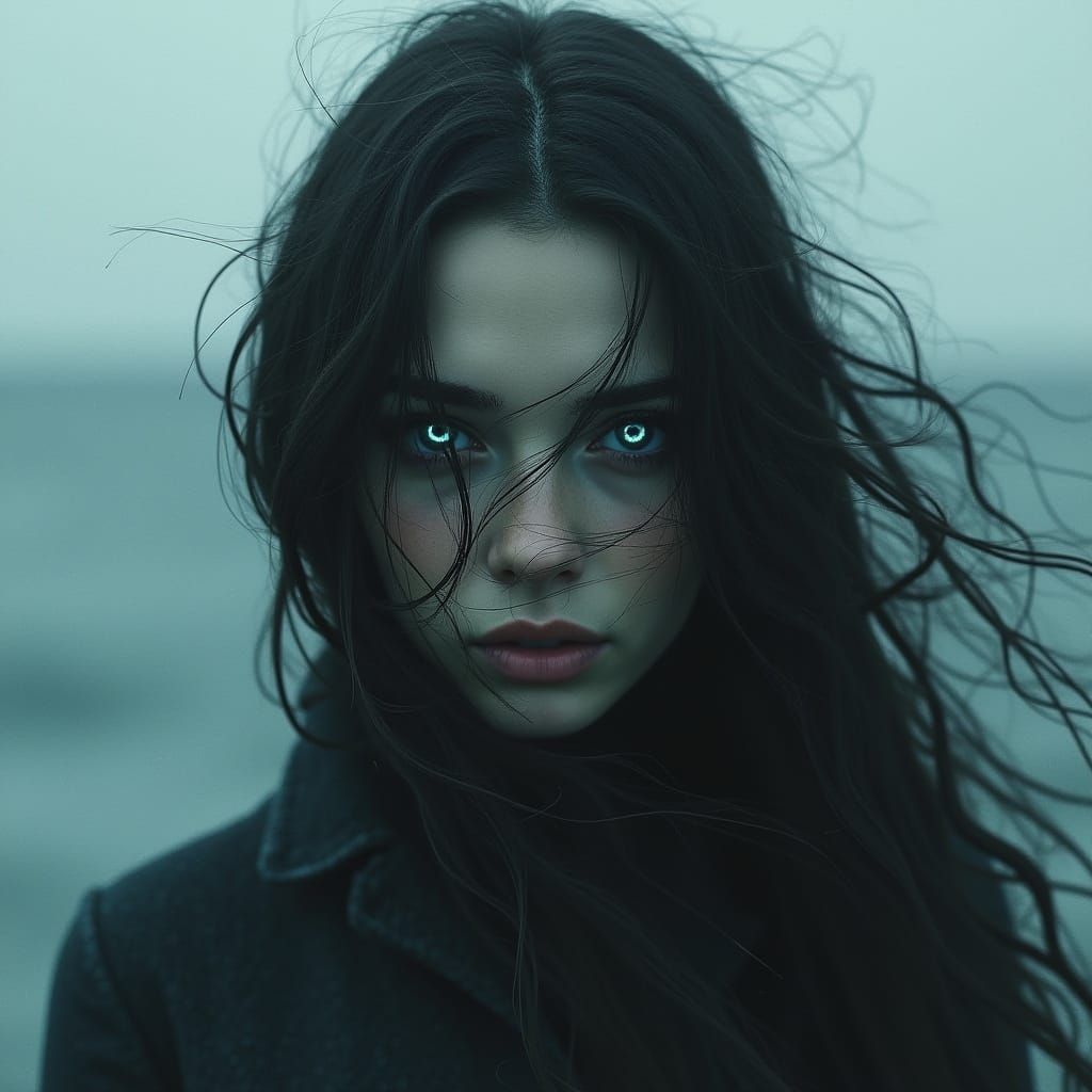 This image shows a woman with long hair blowing in the sea wind, casting mysterious shadows. Her blue eyes gleam through her hair, rendered with muted colors and subtle texture.