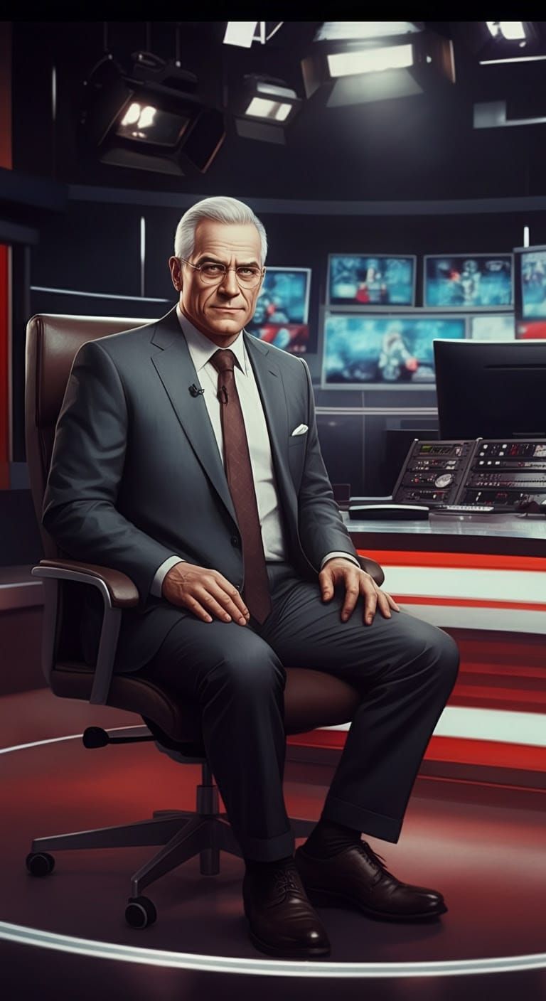 This image shows a senior news anchor in a modern, high-tech broadcasting studio. The scene is lit with warm studio lighting and rendered in a digital comic art style with realistic details.
