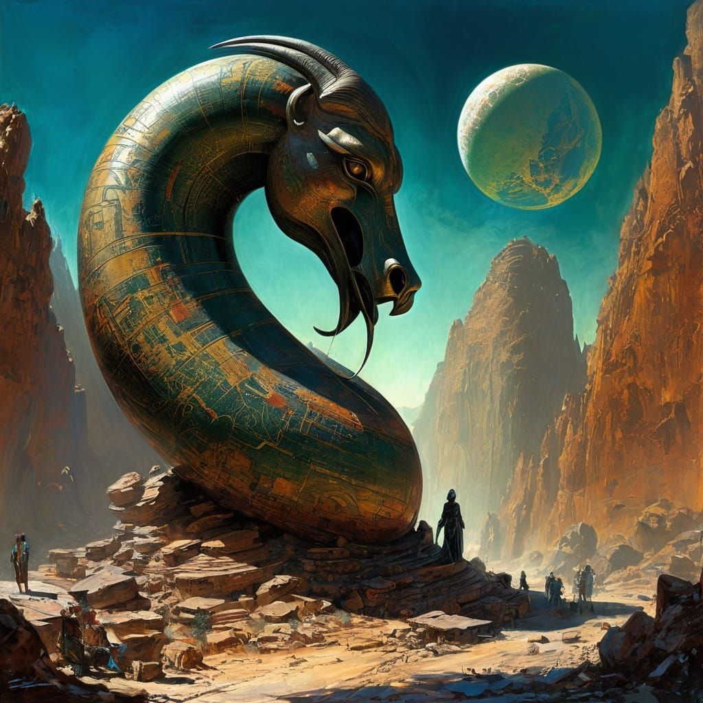 perfect epic masterpiece Extravagant phenomenon fantastical gigantic massive old granite apophis statue on exoplanet canyon landscape retro futuristic prehistoricore ancient art style sci fi fantasy, intricate details insanely detailed,vibrant colors, awe-inspiring by Susan Seddon Boulet,h.r. giger,vlaho ...