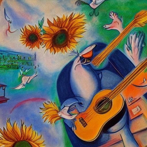 This image shows a guitarist performing on a balcony with a cityscape backdrop. The surreal scene features spinning sunflowers, a laughing seagull, and warm light, rendered with vibrant colors in a whimsical style.