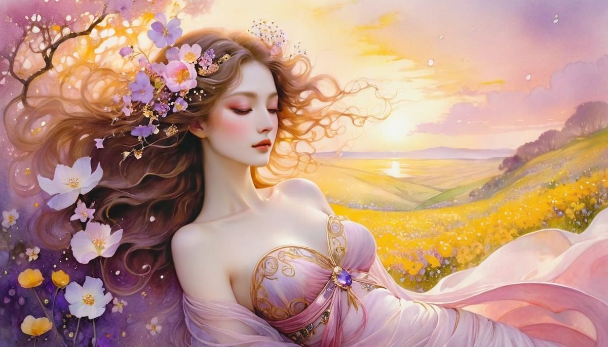 This image shows a beautiful muse posing on a lush bed of spring flowers, surrounded by twisting vines and blooming flowers, in a dreamy, surreal atmosphere with soft, ethereal light and delicate brushstrokes, evoking a whimsical and romantic mood.