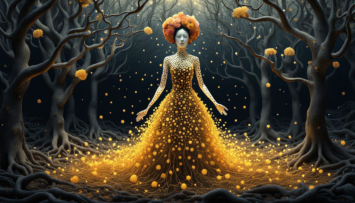 This image showcases a surreal bio art sculpture of a goddess rising from a dark forest floor, surrounded by blossoming flowers and intricate patterns, with a whimsical, dreamlike quality and vibrant colors.