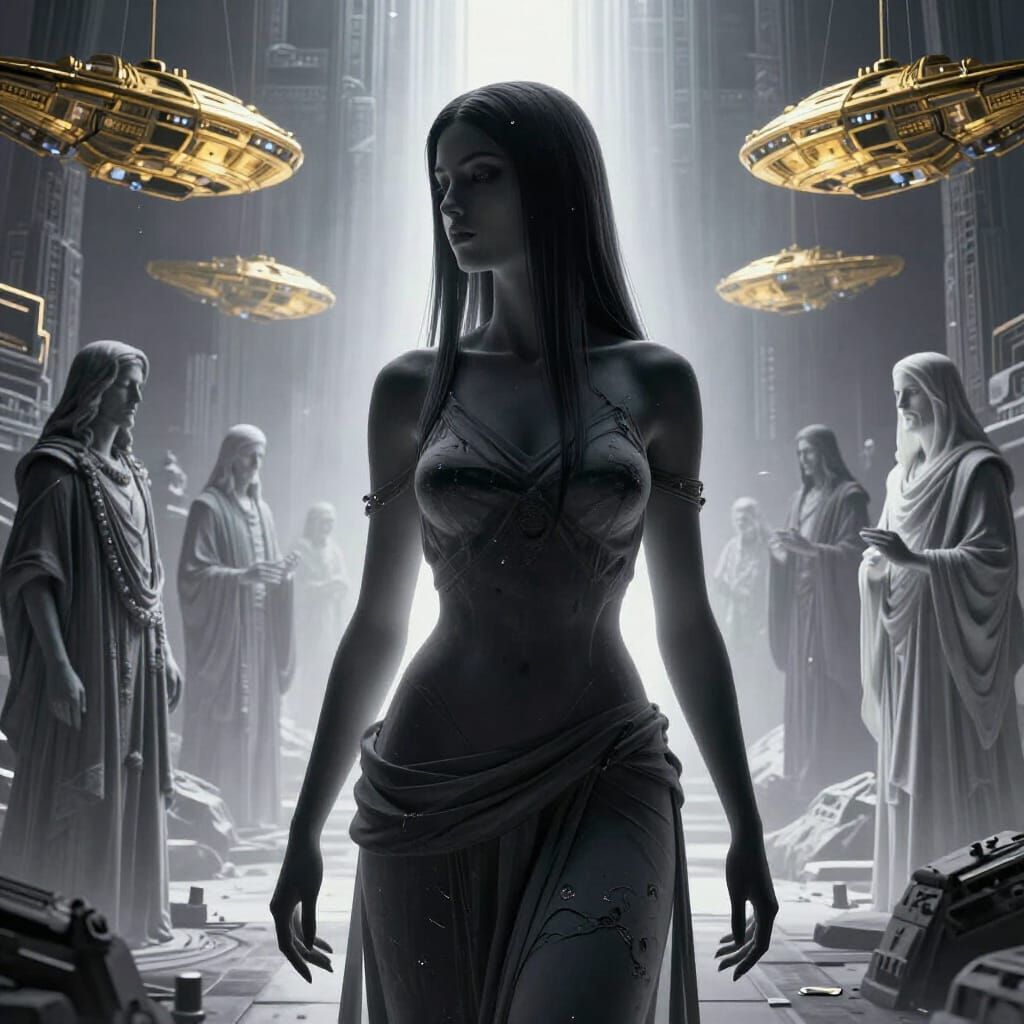 michelangelo paintings guys style in vertex, for glowing up crystal vertex beautiful armenian venus woman with ultra straight hair, very connected spiritual, only bicromic, silouette, shy and astouning face city of shamballah in background with masters, flying gold ships, hard decay, ray of lights between ...