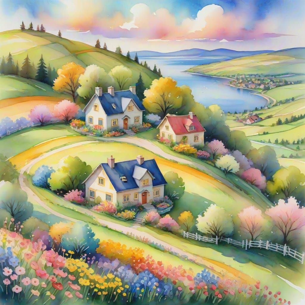 This serene watercolor painting captures a picturesque Scandinavian-inspired cottage on a hilltop, surrounded by vibrant spring flowers and a breathtaking rainbow in the sky, with soft pastel colors and whimsical details.
