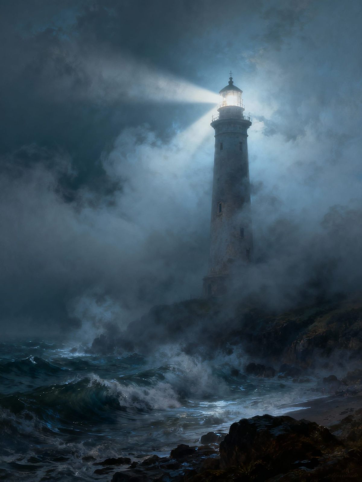 A dramatic digital painting of a lighthouse beam piercing through dense fog on a stormy coast, evoking mystery and isolation with a cool color palette and piercing light.