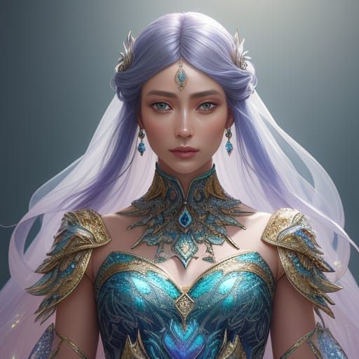 This image is a stunning example of hyperrealistic portrait art, featuring a beautiful woman in intricately detailed, colorful clothing and futuristic jewellery. The oil painting meets digital matte painting style creates a mesmerizing visual effect, with iridescent fabrics shimmering and delicate metall...