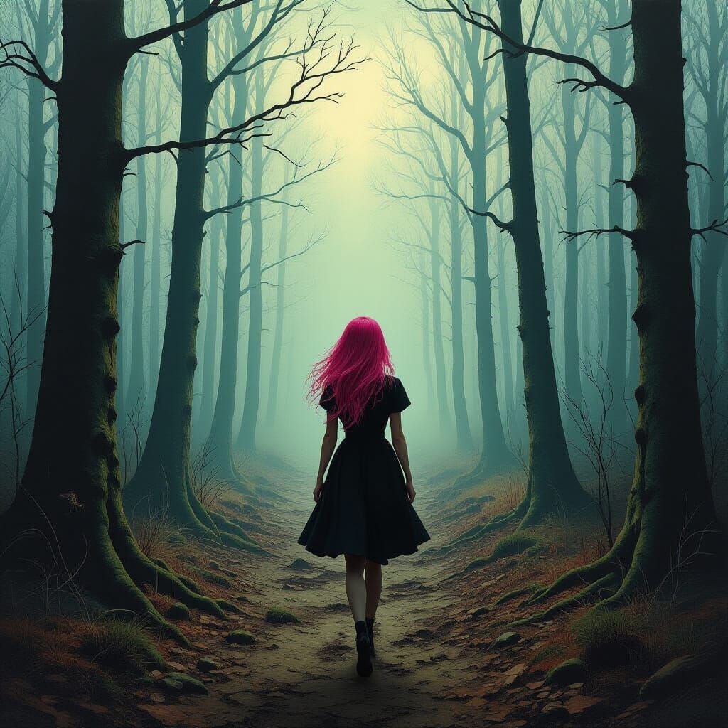 This image shows a pink-haired woman walking into a surreal, creepy forest. Rendered in a matte oil on canvas style reminiscent of Salvador Dali's work.
