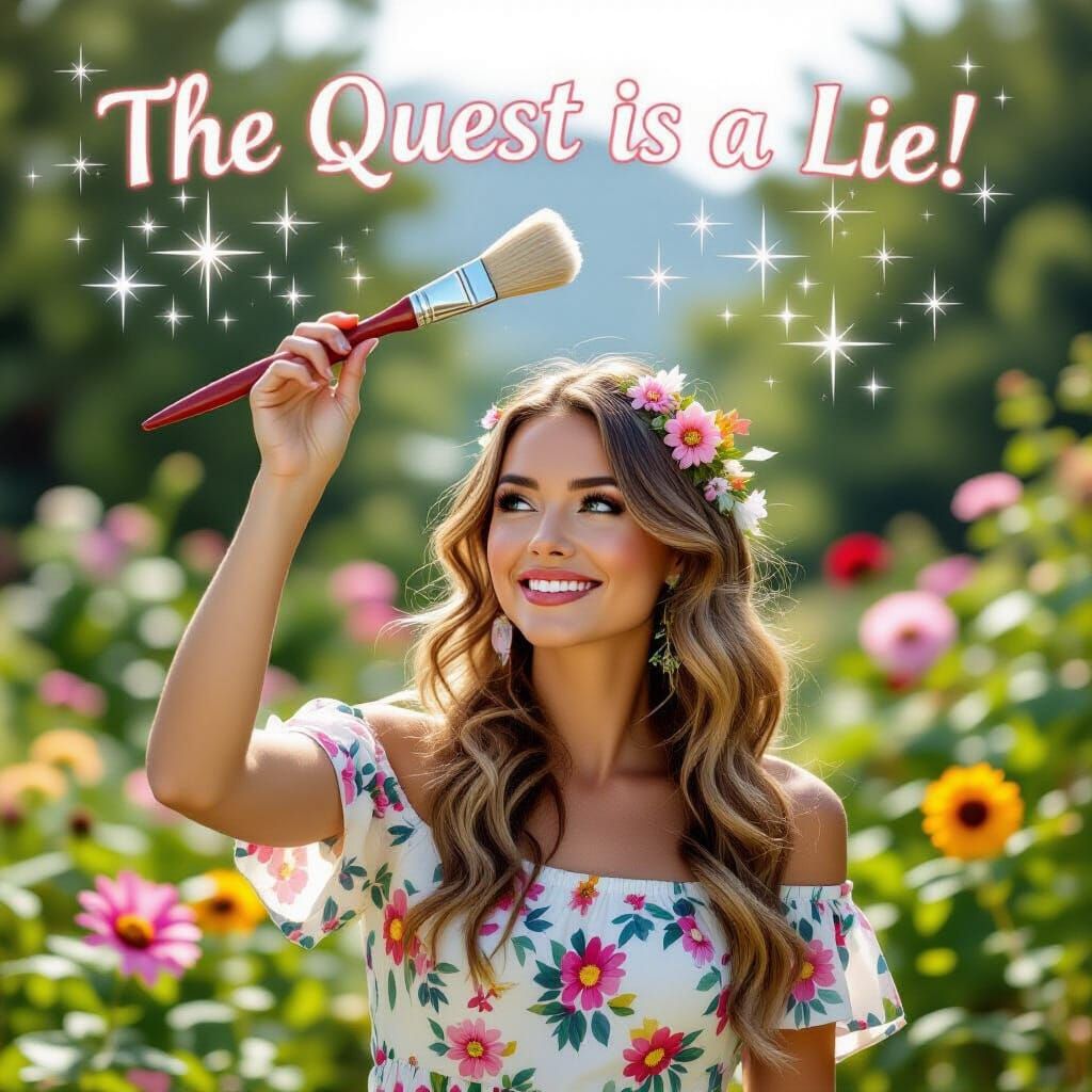 A vintage 1980s photo captures a fairy artist holding a magic paintbrush above her head, with a flower canvas floating and sparkles in a garden.